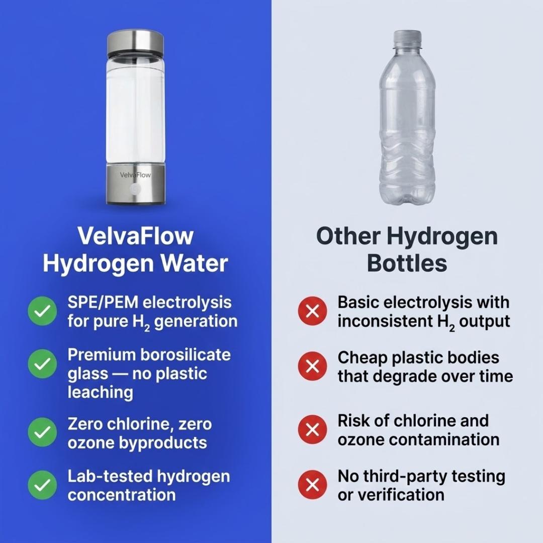 Unlike cheap hydrogen bottles that use basic electrolysis and plastic bodies, VelvaFlow is built for people who want real hydrogen output they can trust, without the chlorine byproducts or guesswork.